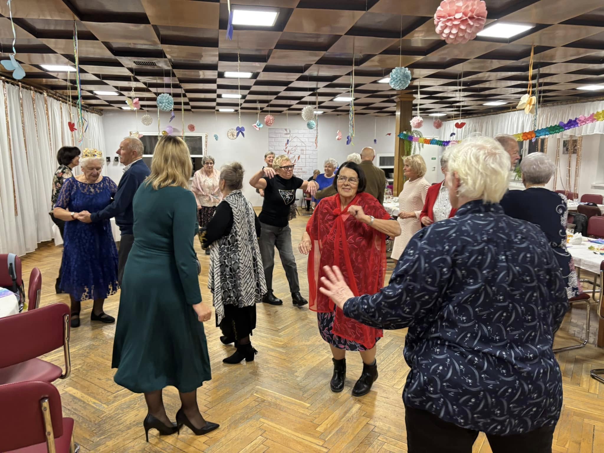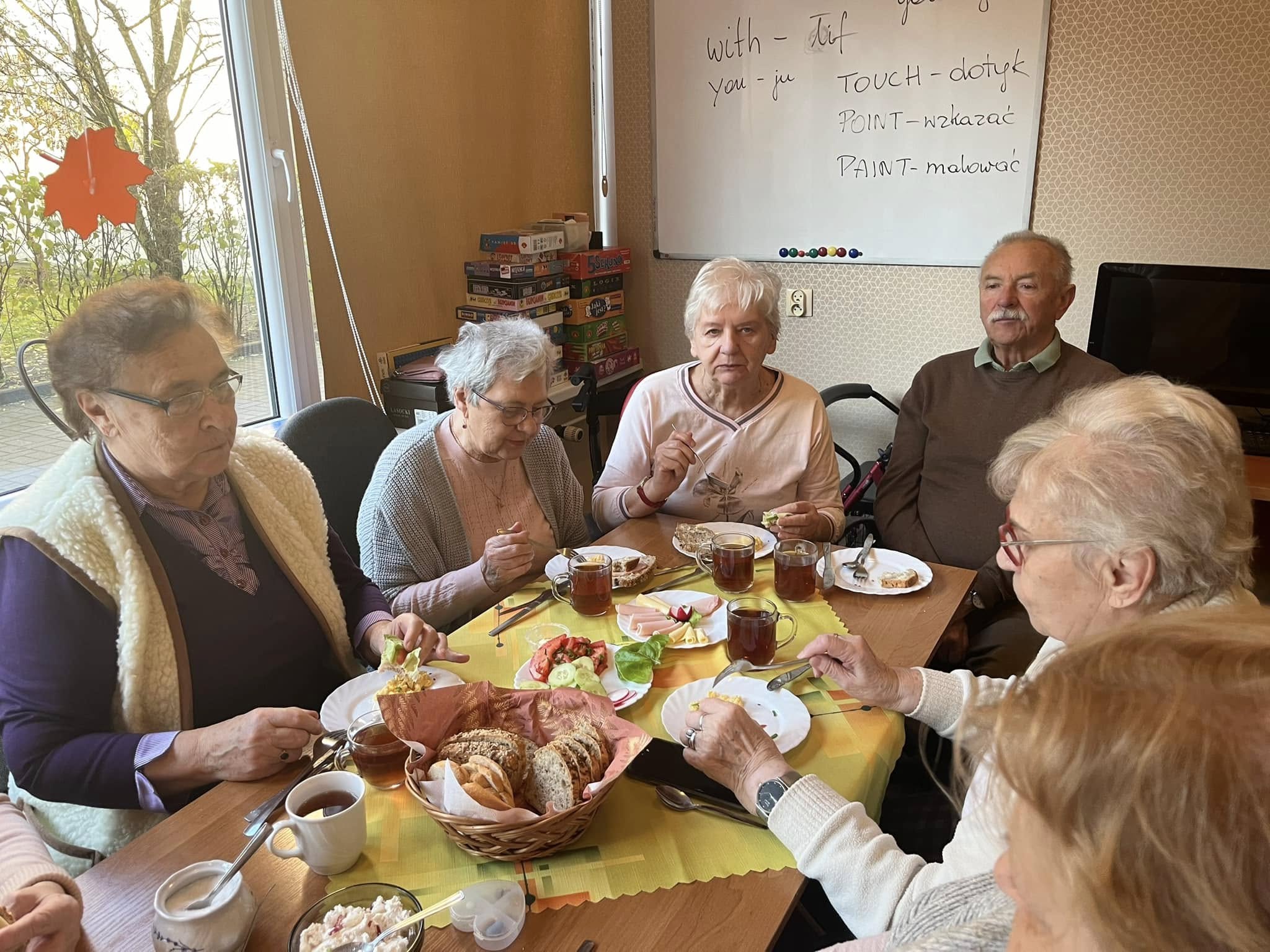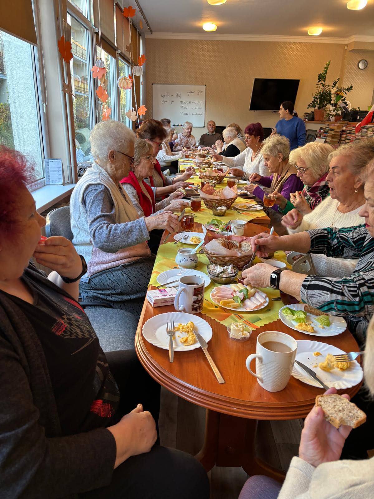 W listopadzie nie zwolniliśmy nawet na chwilę. Miesiąc rozpoczęliśmy wizytą w Publicznym Przedszkolu nr 9 w Kaliszu. Reprezentacja naszych podopiecznych wraz z dziećmi z grupy Biedroneczek wykonały prace, które były zapowiedzią zbliżającego się Święta Niepodległości. Z tej okazji odwiedziła nas Pani Mariola Śmiecińska z Książnicy Pedagogicznej w Kaliszu, która przygotowała dla seniorów pieśni patriotyczne. Przez cały miesiąc odbywały się regularne zajęcia. Szczególnym powodzeniem cieszyła się joga dla seniora. Zarówno ta wymagająca sprawności fizycznej jak i nasza wersja tzw. „Joga śmiechem”. Warto wspomnieć o takich zajęciach jak karaoke, zajęcia plastyczne, spotkania chóru, próby teatralne czy zajęcia kulinarne. Wspólne pieczenie chleba uwieńczyliśmy wspaniałym śniadaniem. Listopad upłynął od znakiem przygotowań do „Dnia Seniora”, który obchodziliśmy 14 listopada. Dziękujemy Wiceprezydentowi Panu Mateuszowi Podsadnemu, Pani Skarbnik Miasta Kalisza oraz wszystkim dyrektorom i kierownikom zaprzyjaźnionych jednostek za obecność i udział w tym święcie. Przedstawienie „O złotej Rybce”, występ chóru, wiersz Pana Czesława, wsytęp Pani Małgorzaty Kraszkiewicz oraz konkurs na „Bajeczne przebranie” to kropla w morzu piątkowego uroczystego popołudnia. Występ zespołu, przepyszne jedzenie oraz tańce, to dopięło całość na ostatni guzik.Dziękujemy także za poduszki, które były drobnym prezentem dla naszych Seniorów a zostały wykonane przez osadzonych w Oddziale Zewnętrznym w Kaliszu Aresztu Śledczego w Ostrowie Wielkopolskim. Miesiąc zakończyliśmy wspólnym świętowaniem urodzin Pani Ani, kończąc na zabawie tanecznej, która mogłaby trwać do rana. W naszym Dziennym Domu nie ma nudy! Kto nie wierzy, zapraszamy!